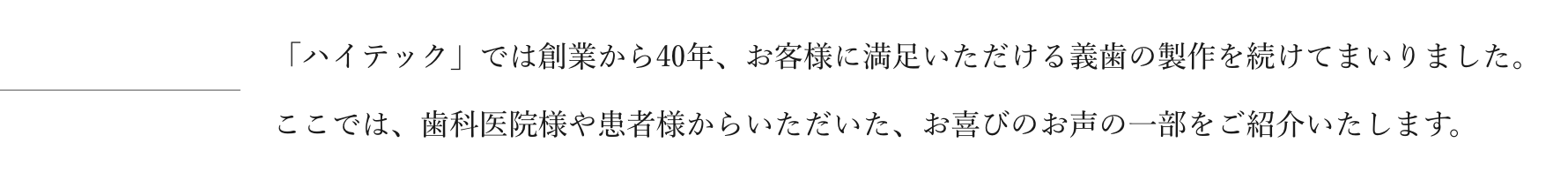 ハイテックは、歯科技工物の製作を通して、全国の患者様に「食べる喜び」「話す楽しみ」をご提供します。遠方の医院様も、どうぞお気軽にお問い合わせください。 各種技工物、お取り引きについてのご質問など、お気軽にお問い合わせください。